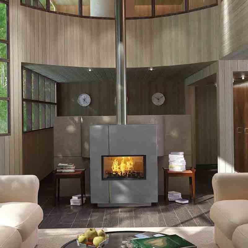 Металлическая отопительная печь-камин. Ввод наружнего/первичного воздуха. Облицовка для топки из нержавеющей стали. Вертикальная полоска-инкрустация из нержавеющей стали. Поднимающаяся и открывающаяся классическим способом дверца.