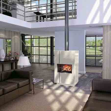 Металлическая отопительная печь-камин. Ввод наружнего/первичного воздуха. Облицовка для топки из нержавеющей стали. Вертикальная полоска-инкрустация из нержавеющей стали. Поднимающаяся и открывающаяся классическим способом дверца. RAL 1013.