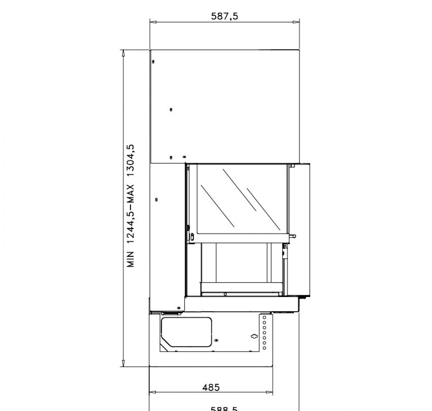 Стальная каминная топка с боковым стеклом. Дверца с подъемом вверх.