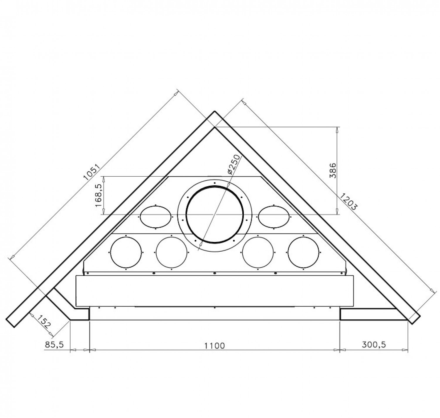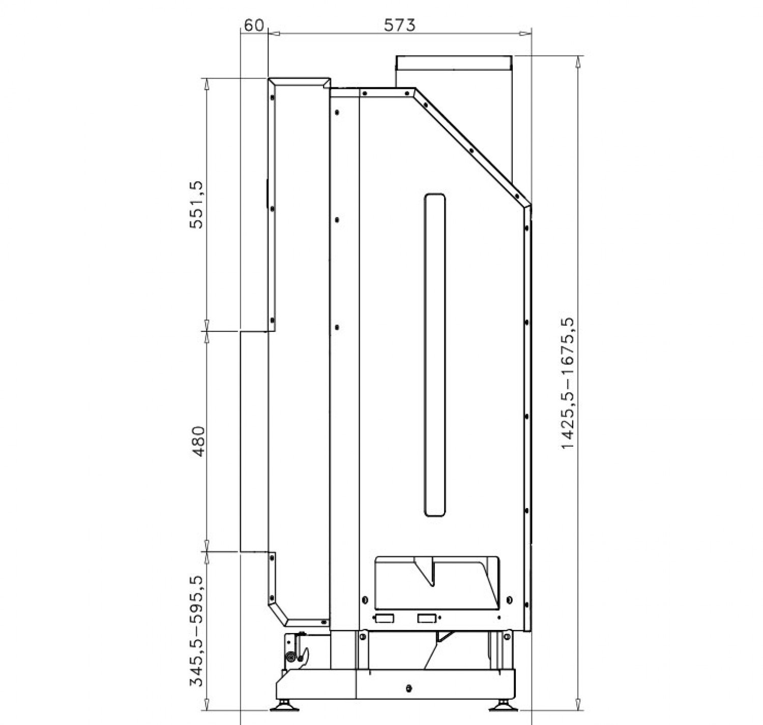 Односторонняя стальная топка с плоским стеклом. Дверца с подьемом вверх. Скошенные углы.