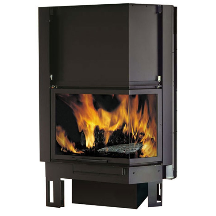 Закрытая топка со стальным корпусом и большим обзором огня. Боковое стекло (правое или левое) под углом 45°. Очаг с чугунной футеровкой. Плавный подъем дверцы - гильотина. Топка может устанавливаться как с фронтальной, так и с угловой облицовкой.