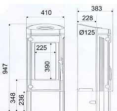 Отопительная печь с большим обзорным стеклом. С камерой вторичного дожига отработанных газов, встроенной колосниковой решеткой и зольным ящиком. На задней стороне печи расположен конвекционный кожух, предназначенный для более быстрого нагрева воздуха в помещении.