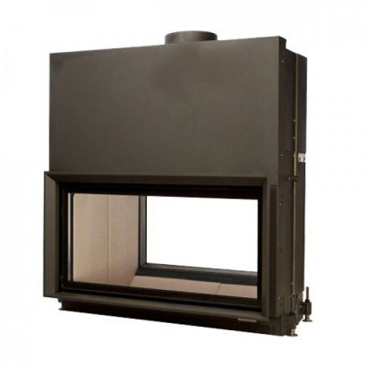 Двухсторонняя каминная топка с прямым стеклом. Топочная камера футерована шамотом. Подъёмный механизм двери (система Easy-Lift) с одной стороны. С другой стороны дверца откидывается для чистки. Ширина дверки 1182 мм. Высота дверки 502 мм. Возможно подключение воздуха извне.