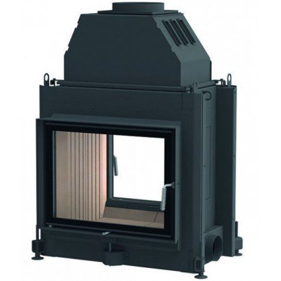 Двухсторонняя каминная топка с прямым стеклом. Топочная камера футерована шамотом. Дверцы с боковым открыванием. Возможно подключение воздуха извне.