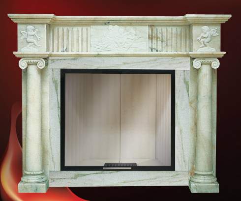Фронтальное расположение, классический стиль. По бокам расположены декоративные круглые колонны. Такой камин прекрасно впишется в любую домашнюю обстановку.