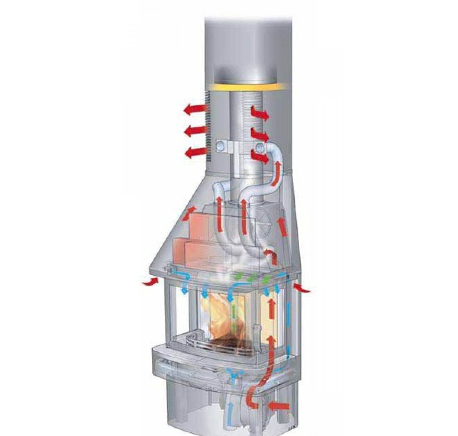 Поворотная колосниковая решетка, теплонакопительный блок, выдвижной зольник и фриз из талькохлорита.