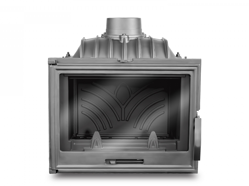 Повышенный КПД и теплоотдачу обеспечивает чугунный дефлектор, который расположен над камерой сгорания каминной топки KAWMET. Назначение дефлектора - направить недогоревшие частицы дровяного газа в центральную часть камеры сгорания, где происходит повторное догорание. Также дефлектор увеличивает тепловую эффективность топки путем удлинения пути прохождения продуктов сгорания.