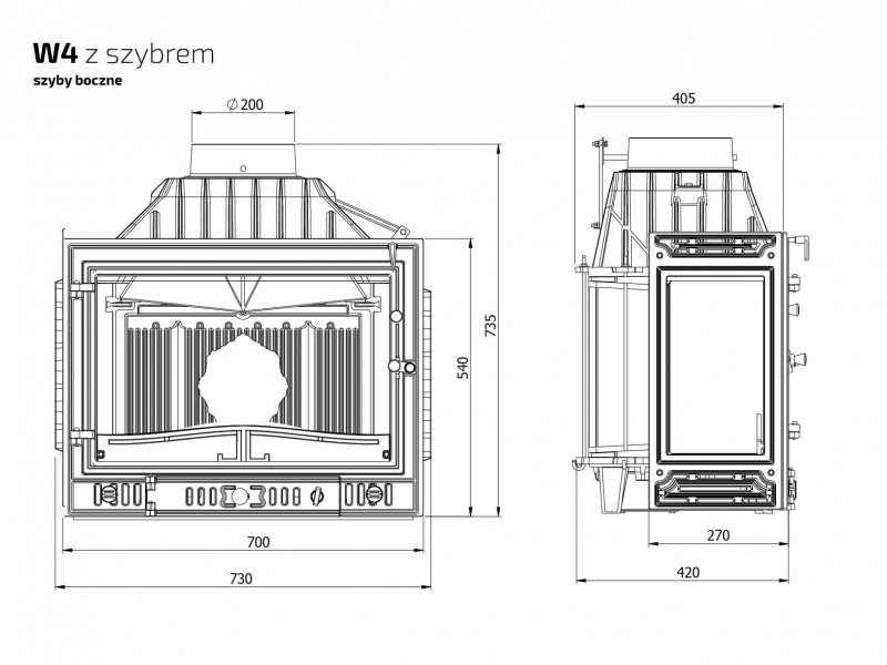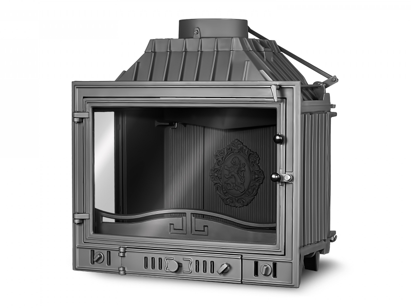 Классическая боковая каминная топка Kaw-Met W4 pb/lb 14,5 кВт с дополнительным стеклом для наслаждения игрой живого укрощенного огня с нескольких сторон, используется для отопления помещений как качественный дизайнерский отопительный прибор, а также как предмет интерьера. Жаростойкая плита в задней части топки декорирована гербом со львом.