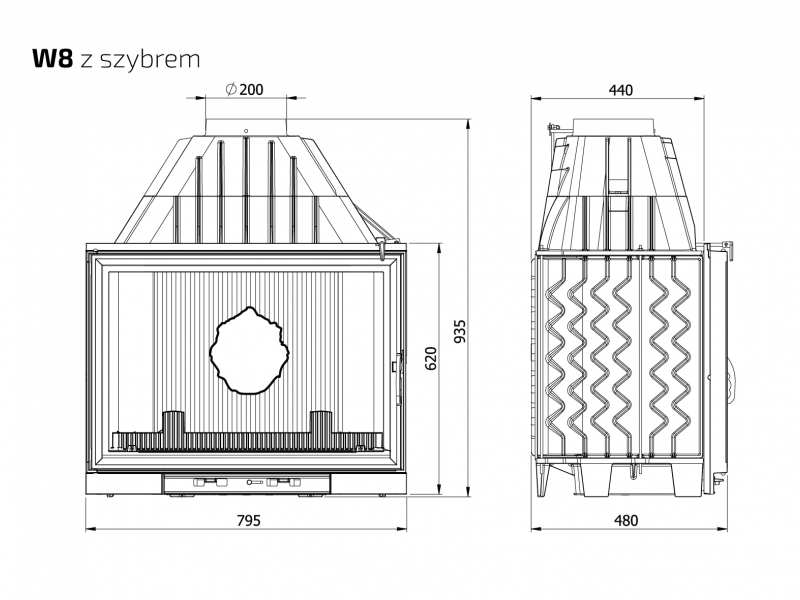 Каминная топка W8-17.5 кВт EKO является классической топкой премиум класса производимой заводом KAWMET по современным технологиям, топка выполнена из толстого чугуна класса EN-GJL- 200 и оборудована подводом наружного воздуха в камеру сгорания, встроенным шибером для регулировки процесса горения и дымоотведения, и более точной регулировкой подачи воздуха через нижнюю часть дверцы под колосниковую решетку, открыв ее на максимум, вы подаете к дровам оптимальное количество воздуха для быстрого розжига.