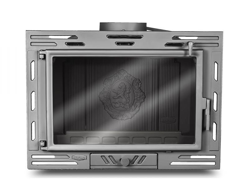 Также особенностью каминных топок KAWMET является наличие встроенной шиберной заслонки с блокиратором дверцы.*