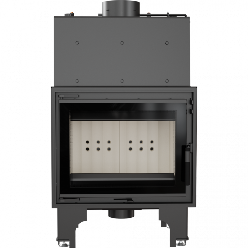 - Система аэрации камеры сгорания, реализована исключительно извне через доставку первичного и вторичного воздуха в камеру сгорания. Стандартно топка имеет подвод воздуха диаметром ø 125 мм, который дает возможность подать свежий воздух в камеру сгорания снаружи здания. Разделение воздуха проходит в пространстве ниже нижней плиты камеры сгорания. Воздух поступает каналом, который находится на высоте нижней плиты к забору, оборудованному вдоль всей длины системой отверстий. Это приводит к улучшениям условий сгорания шихты. Сгорание происходит равномерно по всей ширине камеры сгорания. Регулировка интенсивности сгорания в топке происходит с помощью механизма, который находится ниже дверец топки.