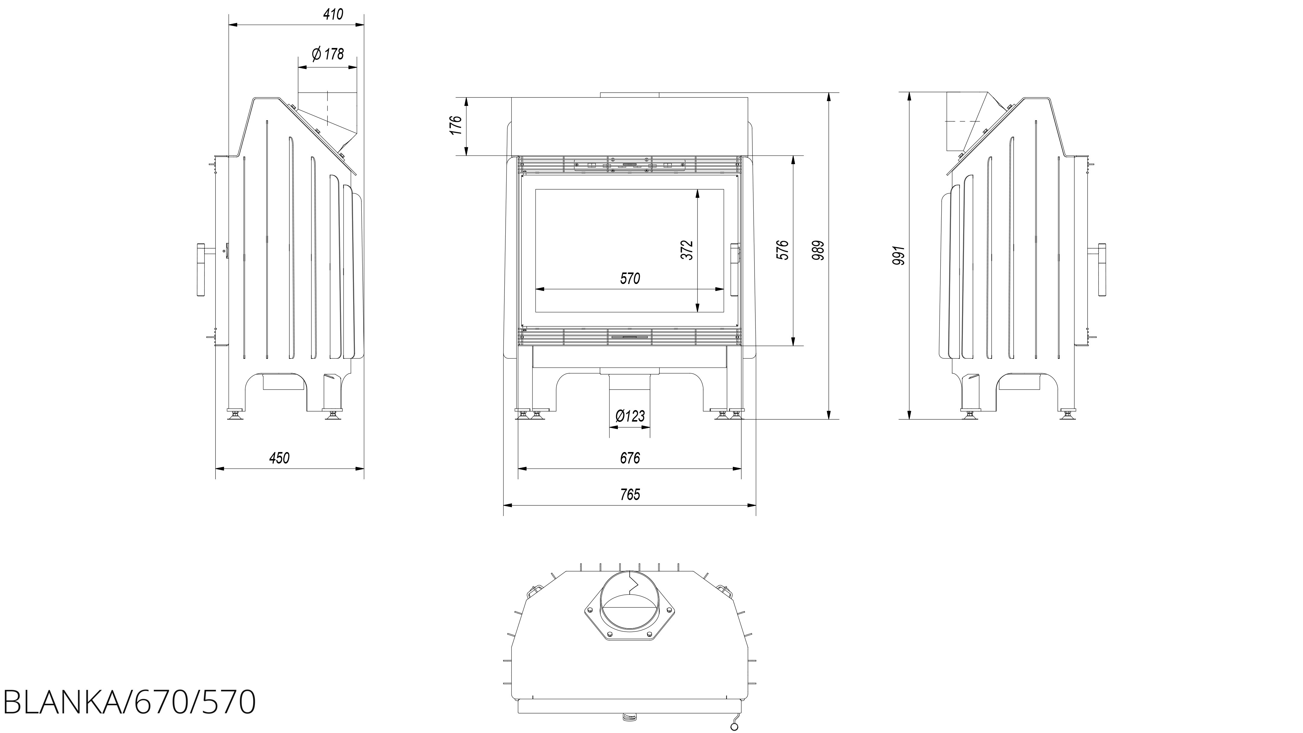 Встраиваемая топка из огнеупорной стали с внутренней футеровкой из керамического материала, призванного накапливать и постепенно отдавать тепло. Представленная модель имеет фасад с прямым стеклом, серия Blanka относиться к «вертикальным» топкам закрытого типа.