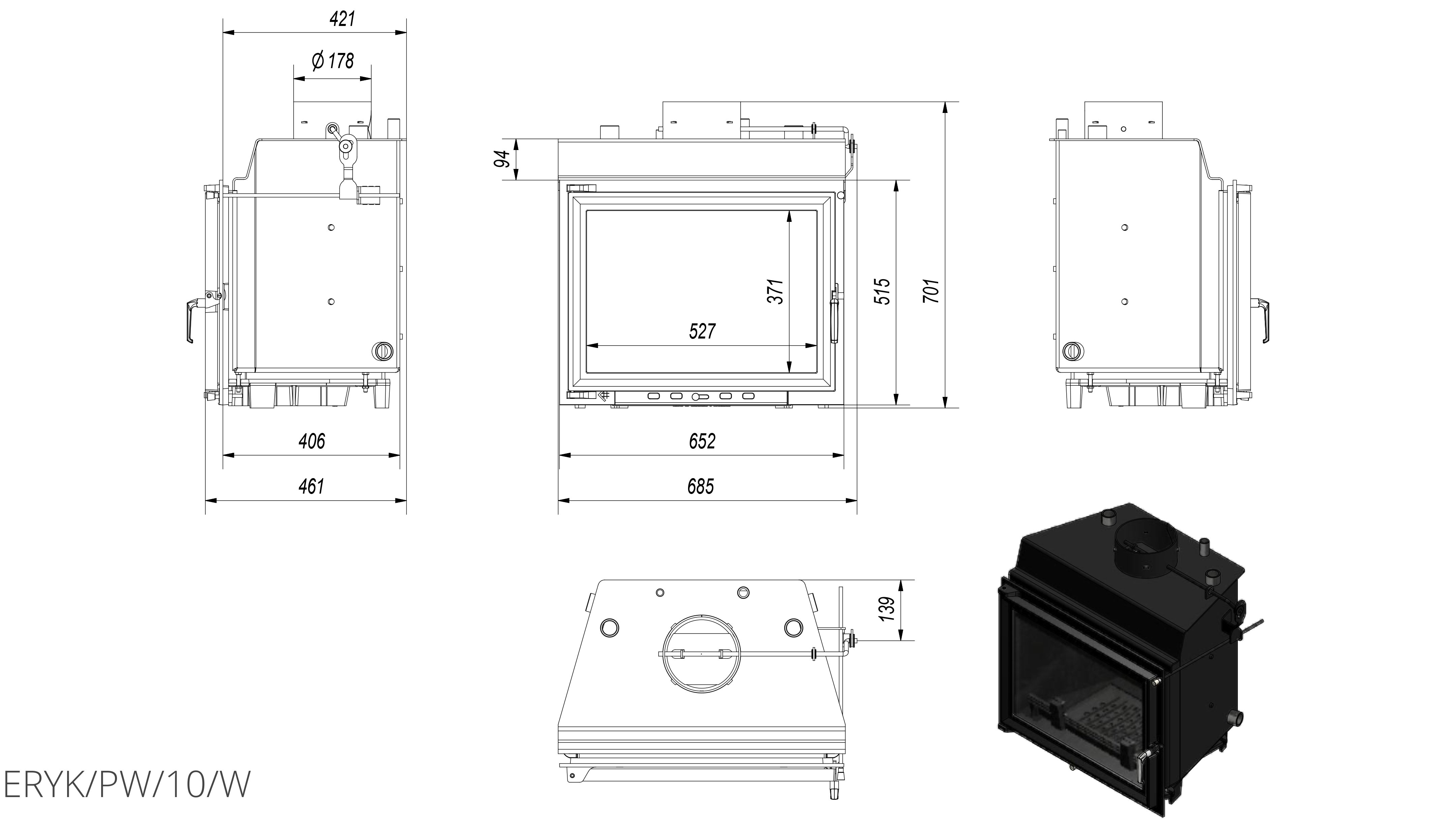 Каминная топка с водяным контуром Kratki Eryk/PW/10/W выполнена из чугуна и имеет металлический корпус (или так называемую «рубашку»), под которым циркулирует вода, используемая в системе отопления.