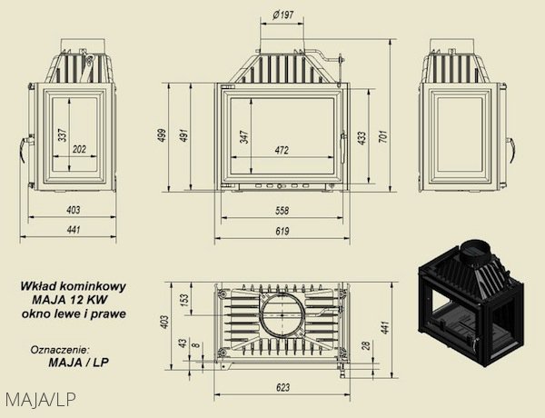Топка для камина непрерывного сгорания серии Maja/LP(стекло слева-справа) – надежный отопительный прибор от польской компании Kratki. Серия каминных топок Maja LP – это отопительные приборы высокой надежности, которые работают на дровах.