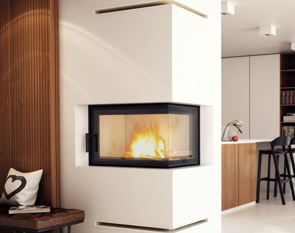 - Каминная топка с двумя стеклянными панелями, сопоставленными друг напротив друга под прямым углом (стеклянные панели соединены без рамы).