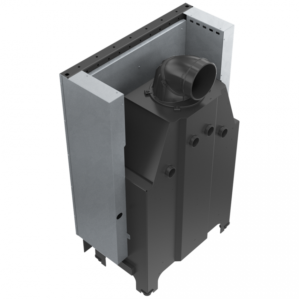 • Высокий переход из камина в дымоход и размещены поперек водяные дефлекторы увеличивают поверхность теплообмена между топкой и окружающей средой. Понижение температуры дымовых газов приводит к увеличению мощности устройства.