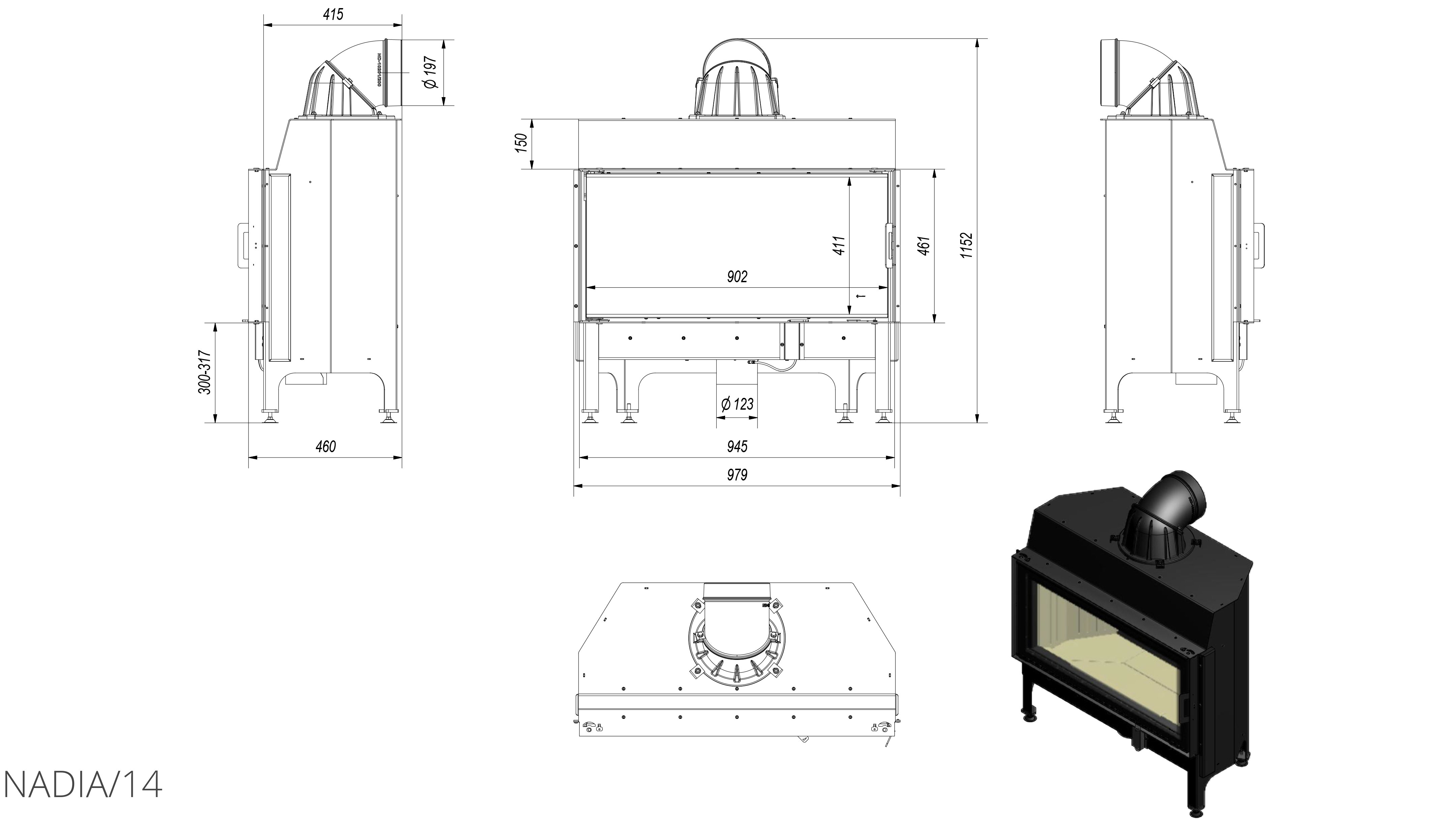 Nadia является футеровкой с корпусом и передним картриджем, которые изготовлены из стальных листов, благодаря чему подходят для эксплуатации в условиях повышенных температур. Представленная модель обеспечена декоративным стеклом, которое выдерживает очень высокую температуру, оно покрыто методом трафаретной печати , который обеспечивает камину современный и очень элегантный внешний вид.