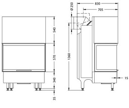 Компактная облицовка с боковыми панелями из майолики и закругленная фронтальная панель с изготовленным вручную декоративным барельефом доступны в широком ассортименте цветов. Cтальная рамка с отделкой из черной эмали (на фотографии изображена версия Terra Cotta, дровяная топка 555T SL с закругленной панелью из керамического стекла).