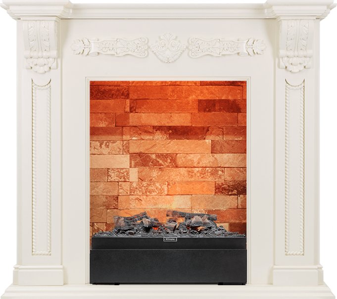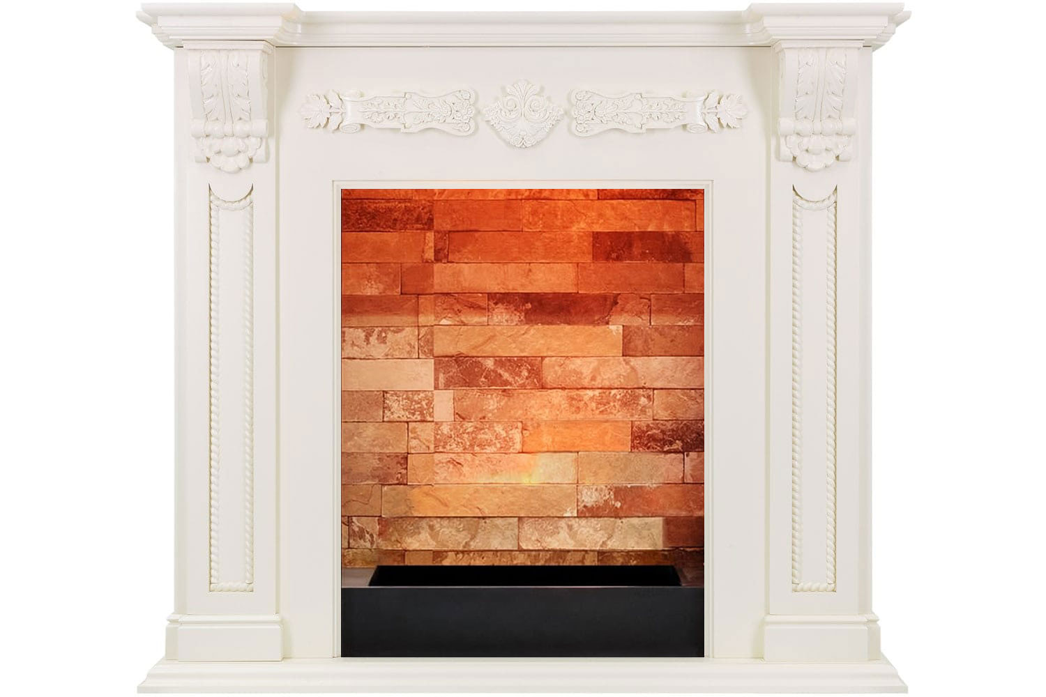 Портал представлен в цвете слоновая кость. Узкая столешница и пьедестал добавляют ему изящности, узкие колонны с резным орнаментом красиво обрамляют зону очага.