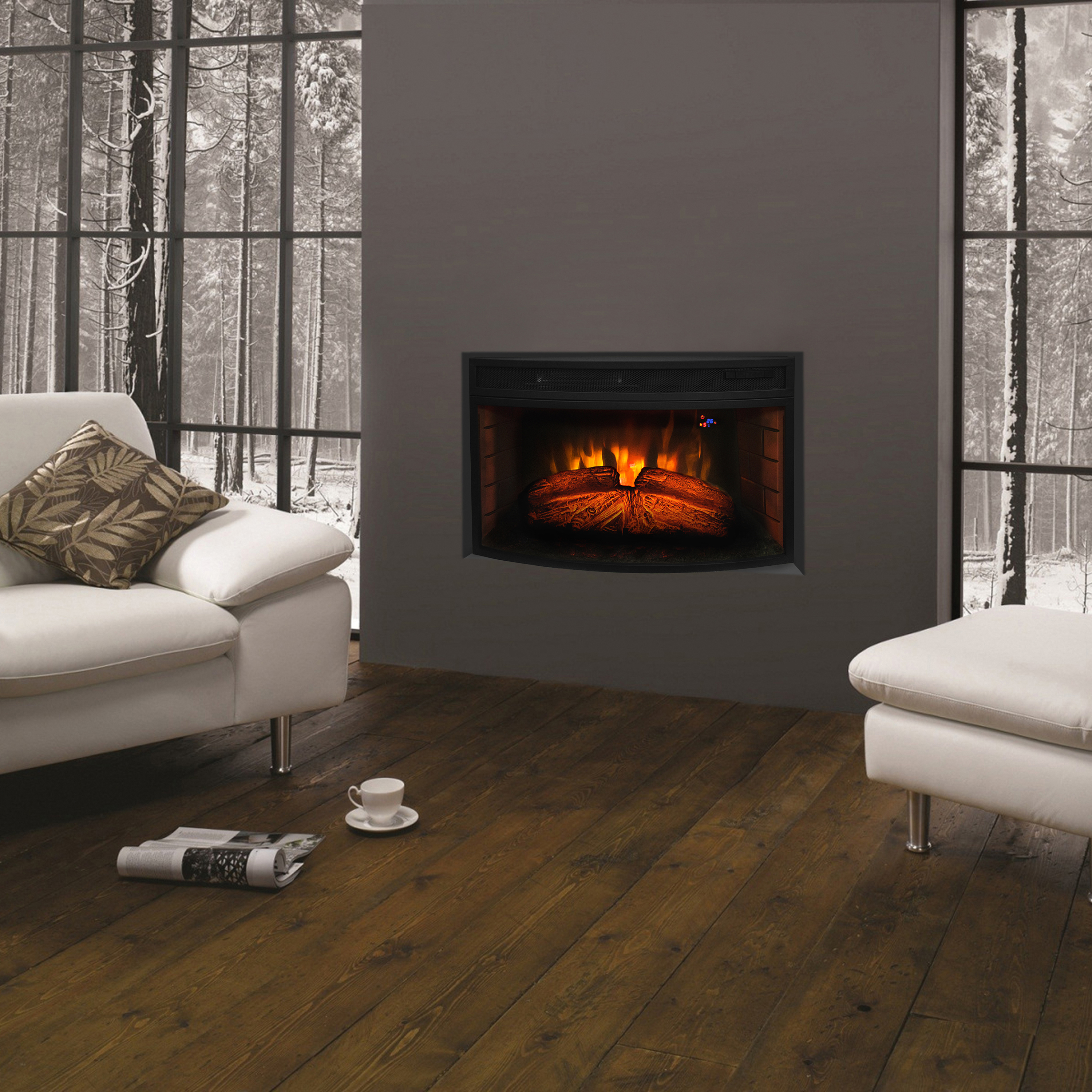 Современный электрический очаг RealFlame FireSpace 33W S IR с пультом ДУ на светодиодах. Предназначен очаг для встраивания в обрамления под широкий очаг. С потрясающим эффектом пламени (многоцветное пламя) и муляжом дров расположенных за полукруглым (панорамным) фронтальным стеклом